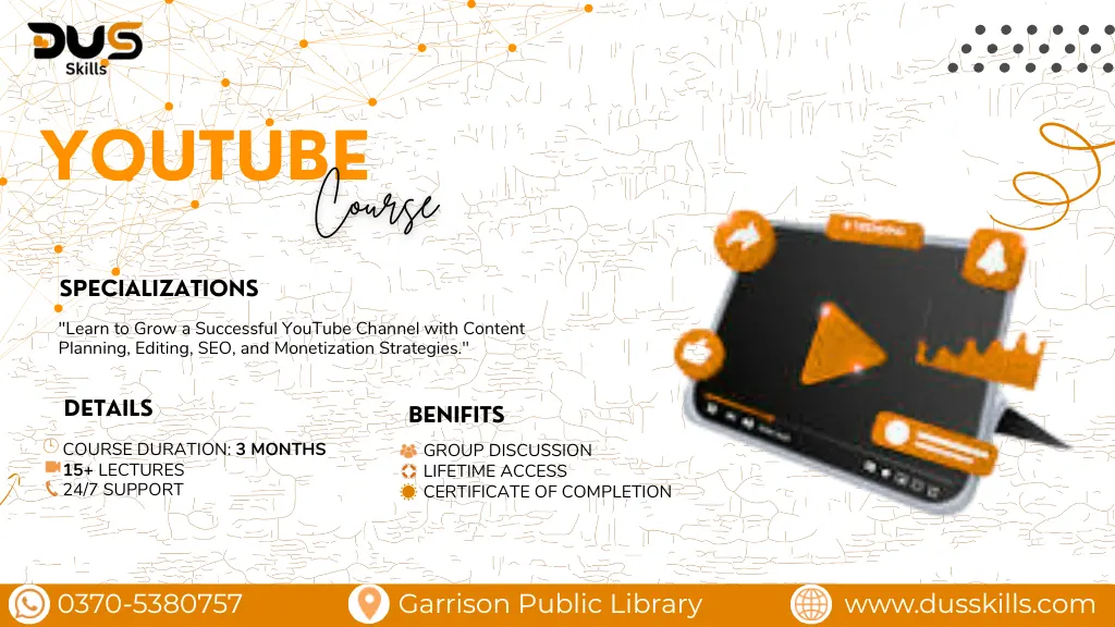 Learn how to create professional videos, grow your channel, and monetize content to build a sustainable online income. With hands-on training and proven strategies, this course prepares you to dominate the YouTube platform. Enroll now and start your journey with DUS Skills!